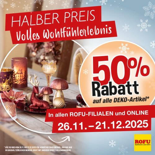 Ab sofort bis zum 21.12.2025 erhaltet ihr 50% auf alle Deko-Artikel in unserer ROFU Filiale im HEP sowie im Onlineshop!